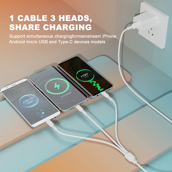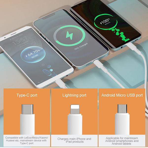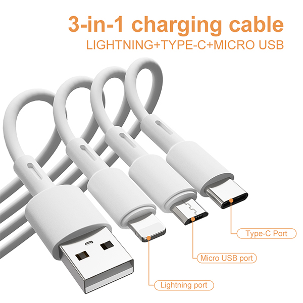 · Interface: USB to micro + iPhone + typeC · Cable Length: 1000mm · Electricity:2.4A · Wire Material: TPE · Color:White